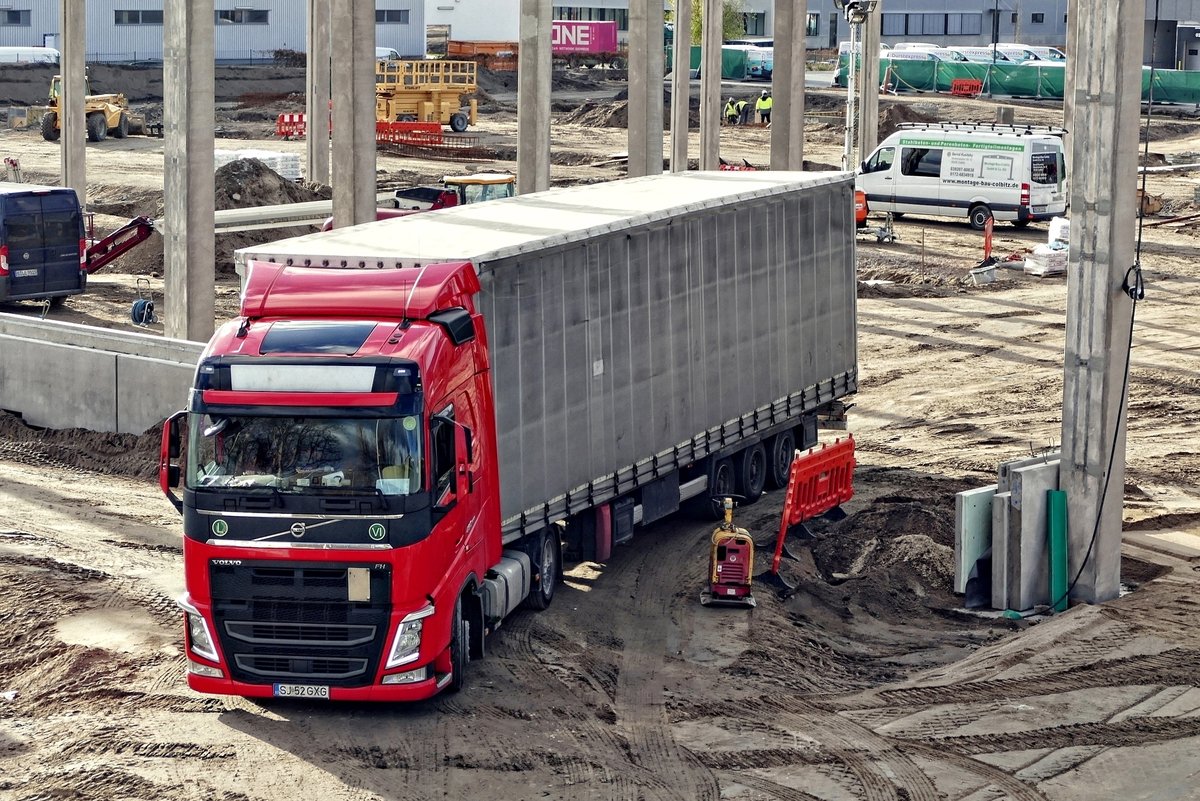 Volvo FH -Sattelzug auf einer Berliner Baustelle im Dezember 2018.