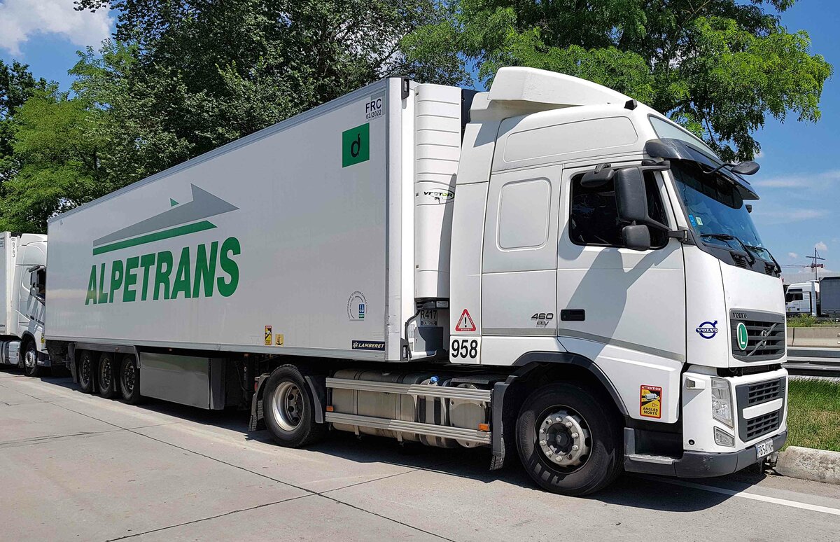 =Volvo FH 480-Sattelzug steht im einem Auflieger von ALPETRANS auf dem Rasthof Bruchsal, 07-2021
