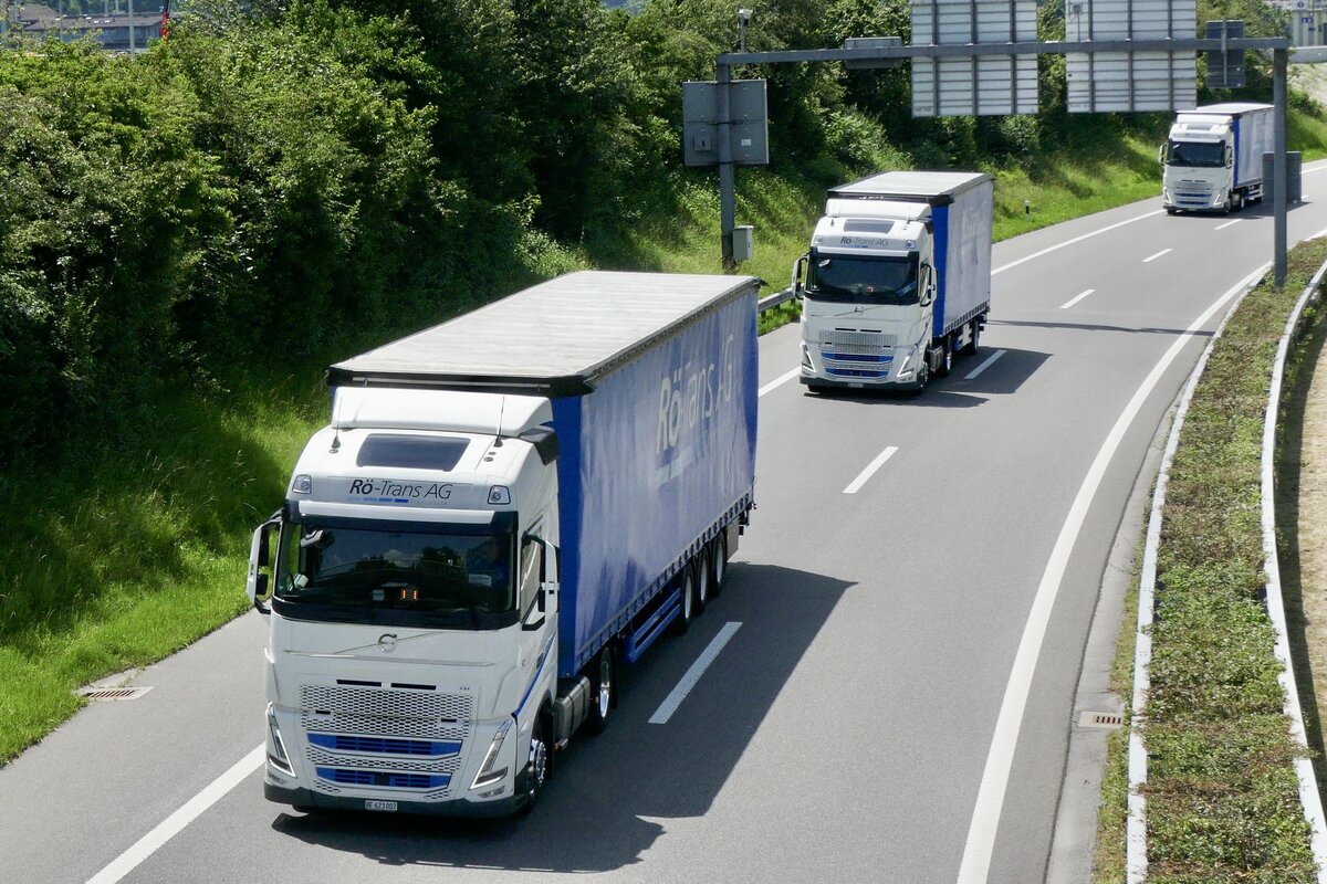Drei Volvo Sattelzüge von Rö-Trans die am 28.6.24 unterwegs zum Trucker Festival sind auf der A8 in Matten b. Interlaken.