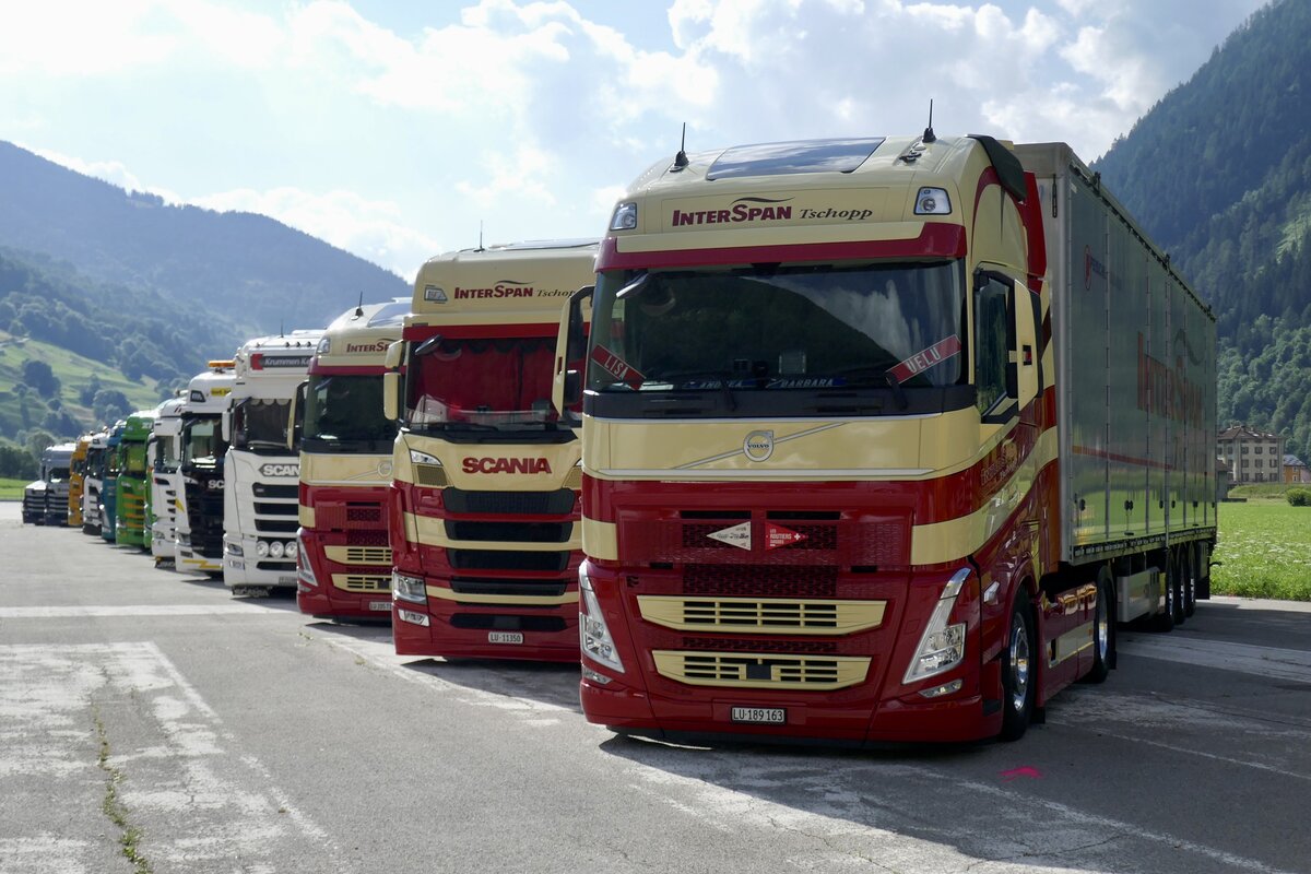 Zwei Volvo und Scania Sattelzüge von Interspan und Krummen Kerzers die am 14.7.24 beim Trucker Treffen in Ambri stehen.
