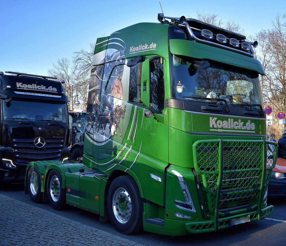 Koalick Logistik GmbH mit einer neuen gewaltigen VOLVO FH Truck Zugmaschine am 08.01.24 Großer Stern Berlin bei der Demo der Landwirte.