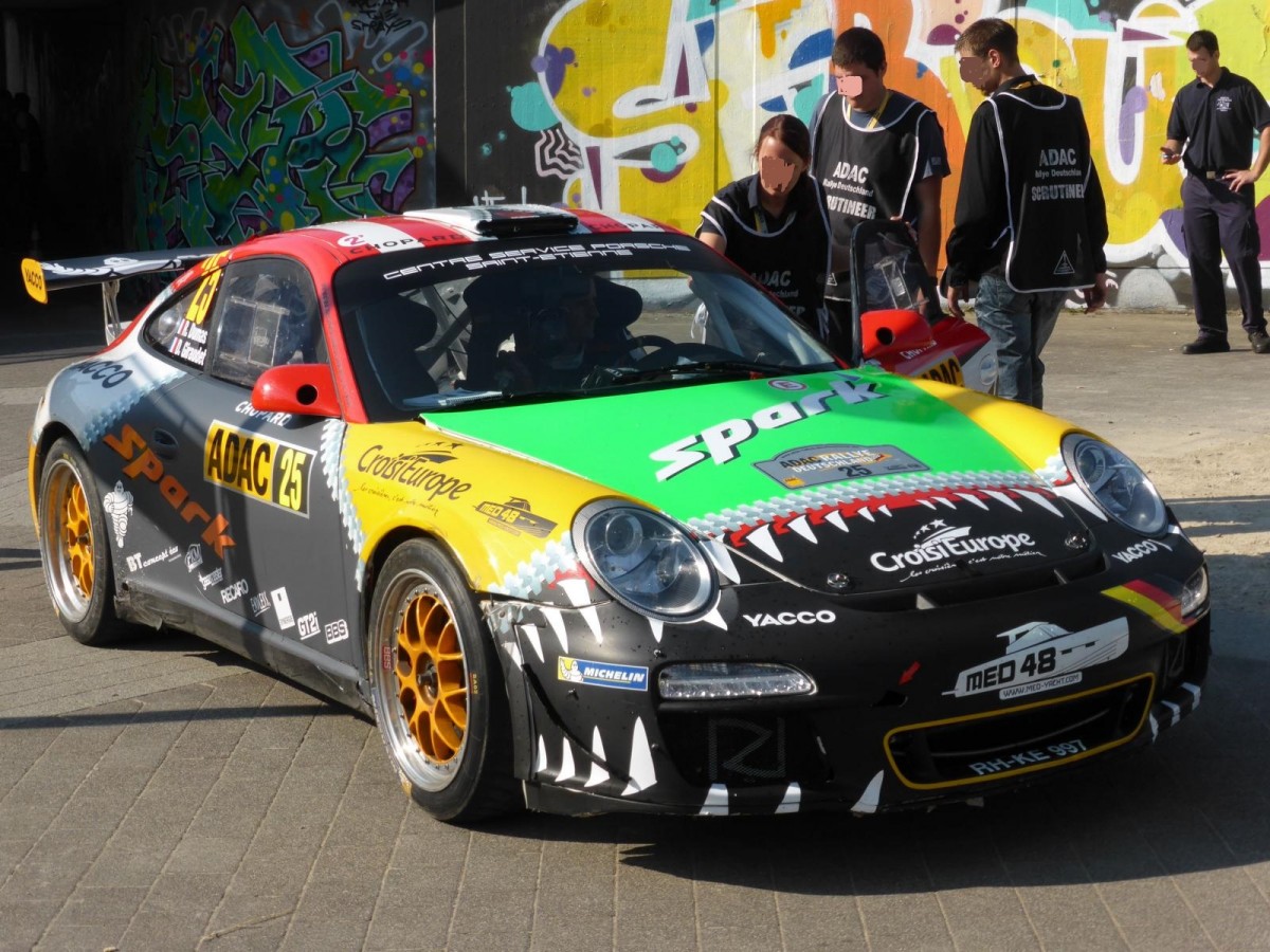 Porsche 911 GT3 (Romain Dumas / Denis Giraudet) im Servicepark der Deutschland-Rallye, 23.08.2015