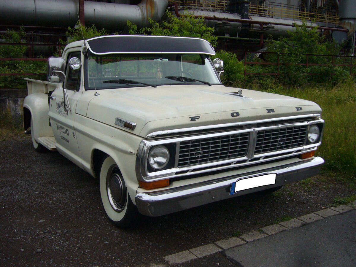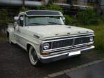 Ford F100 Stepside-Truck im Farbton pure white aus dem Jahr 1970. Die F100-Trucks der Modelljahre 1967 bis 1972 gehörten zur so genannten fünften Generation. Ein solcher Truck war ab US$ 2638,00 zu haben. Er war dann aber recht spartanisch ausgestattet und motorisiert. Das Modell war mit zwei Sechszylinderreihenmotoren mit Hubräumen von 240 cui (3933 cm³) und 300 cui (4916 cm³), sowie drei V8-Motoren mit 302 cui (4949 cm³), 360 cui (5899 cm³) und 390 cui (6391 cm³) lieferbar. Das Leistungsspektrum bewegte sich von 150 PS bis 255 PS. Oldtimertreffen am Theater an der Niebu(h)rg am 19.10.2025 in Oberhausen/Rheinland. Michael H.