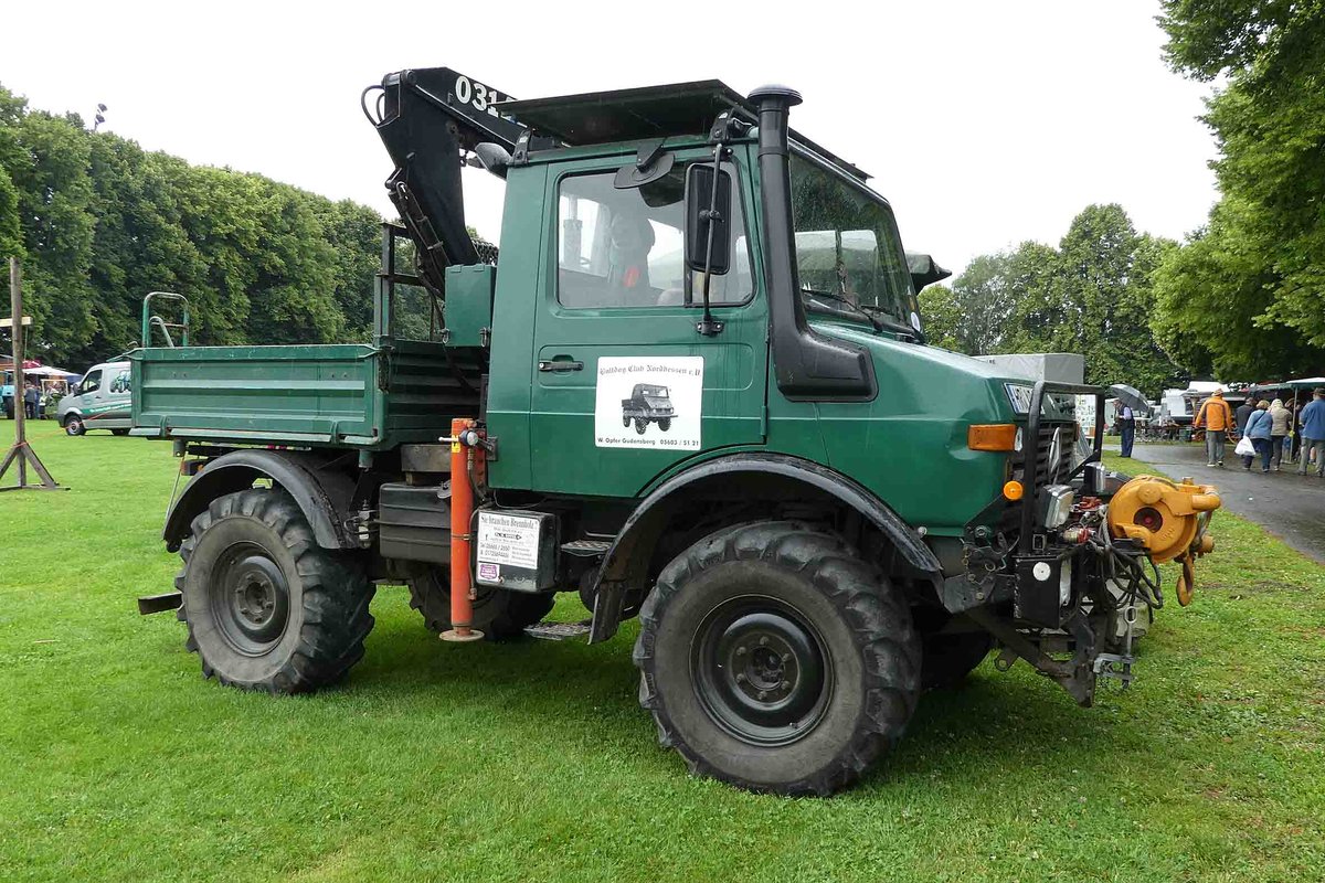 =Unimog mit Ladekran und Frontseilwinde steht im Juli 2016 zur Oldieausstellung in Gudensberg