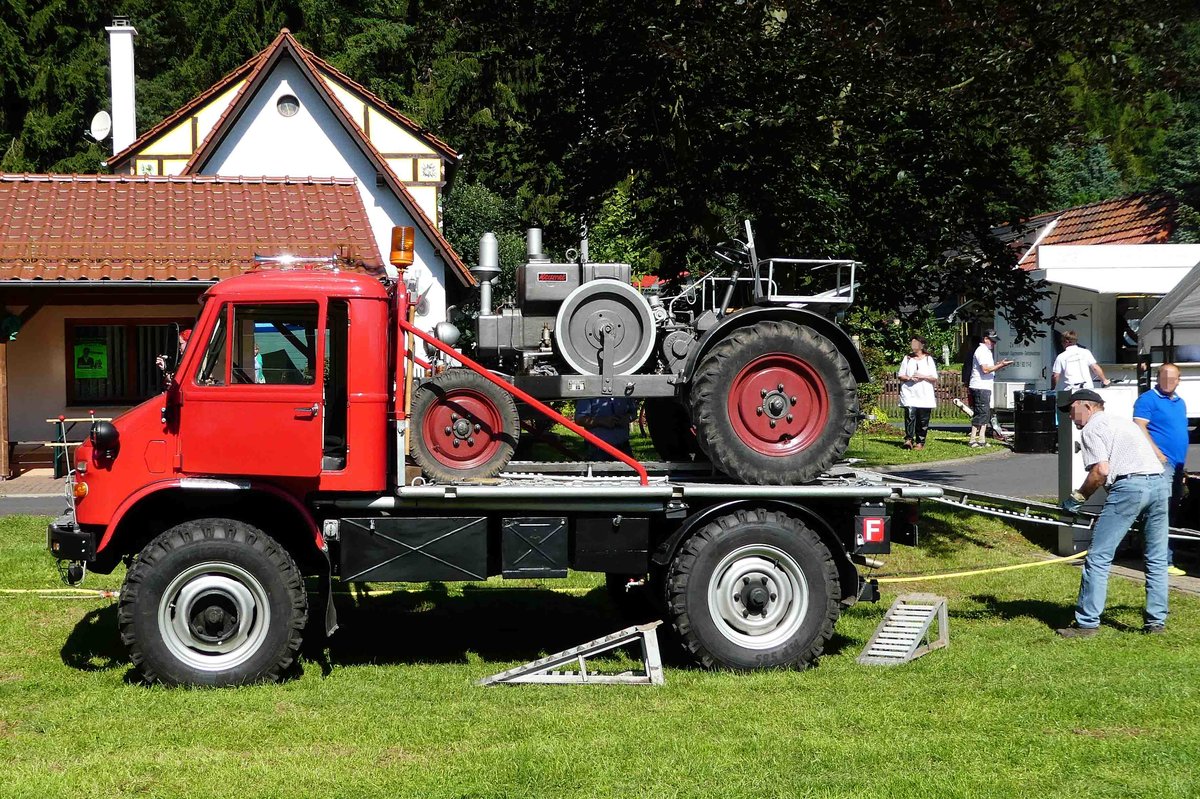 =Unimog steht zur Entladung auf dem Ausstellungsgelände des Pferdsdorfer Oldtimertages im August 2016