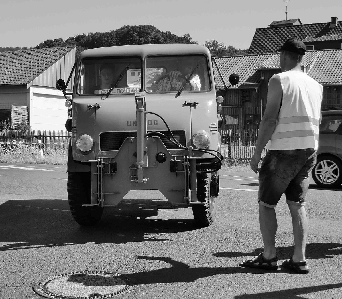 =Unimog unterwegs auf dem Ausstellungsgelände bei der Oldtimerveranstaltung der "Alten Zylinder" in Hilders, Juni 2019