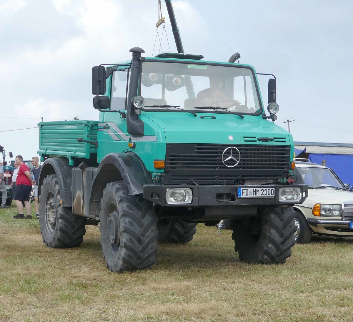 =Unimog rollt bei der Oldtimerausstellung in Uttrichshausen über das Ausstellungsgelände. 07-2019