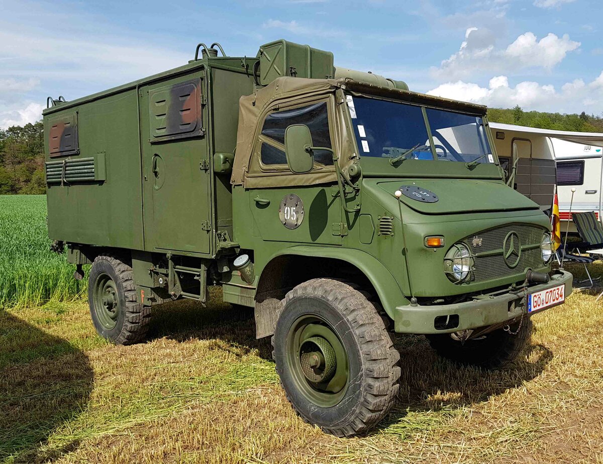 =Unimog steht auf dem Ausstellerparkplatz bei der Oldtimerausstellung der Traktorfreunde Wiershausen am Klostergut Hilwartshausen, 05-2023