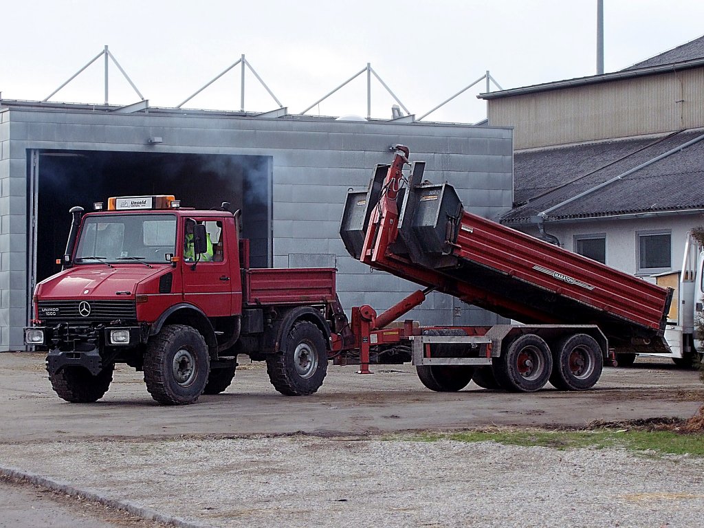 Unimog-1000 verrichtet mit einem Maraton-Kippanhänger Transportarbeiten;110121