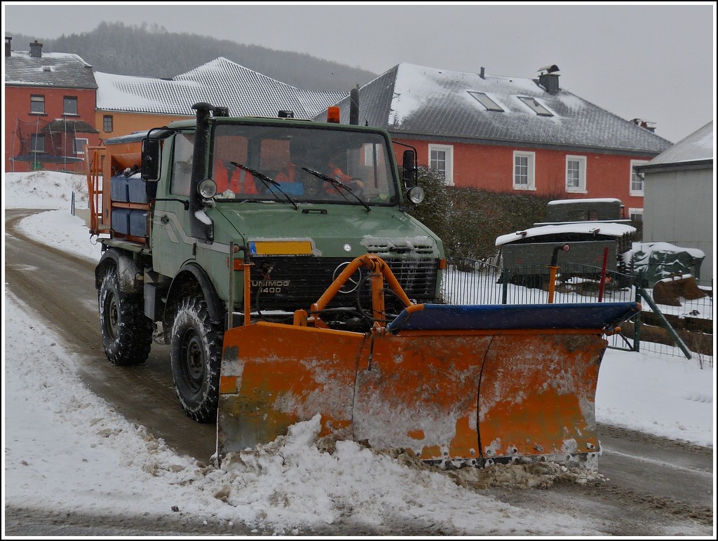 Der Winter ist zurück, am 14.03.2013 war dieser Unimog mit Schneeschieber in den kleinen Nebenstraßen im Dauereinsatz.
