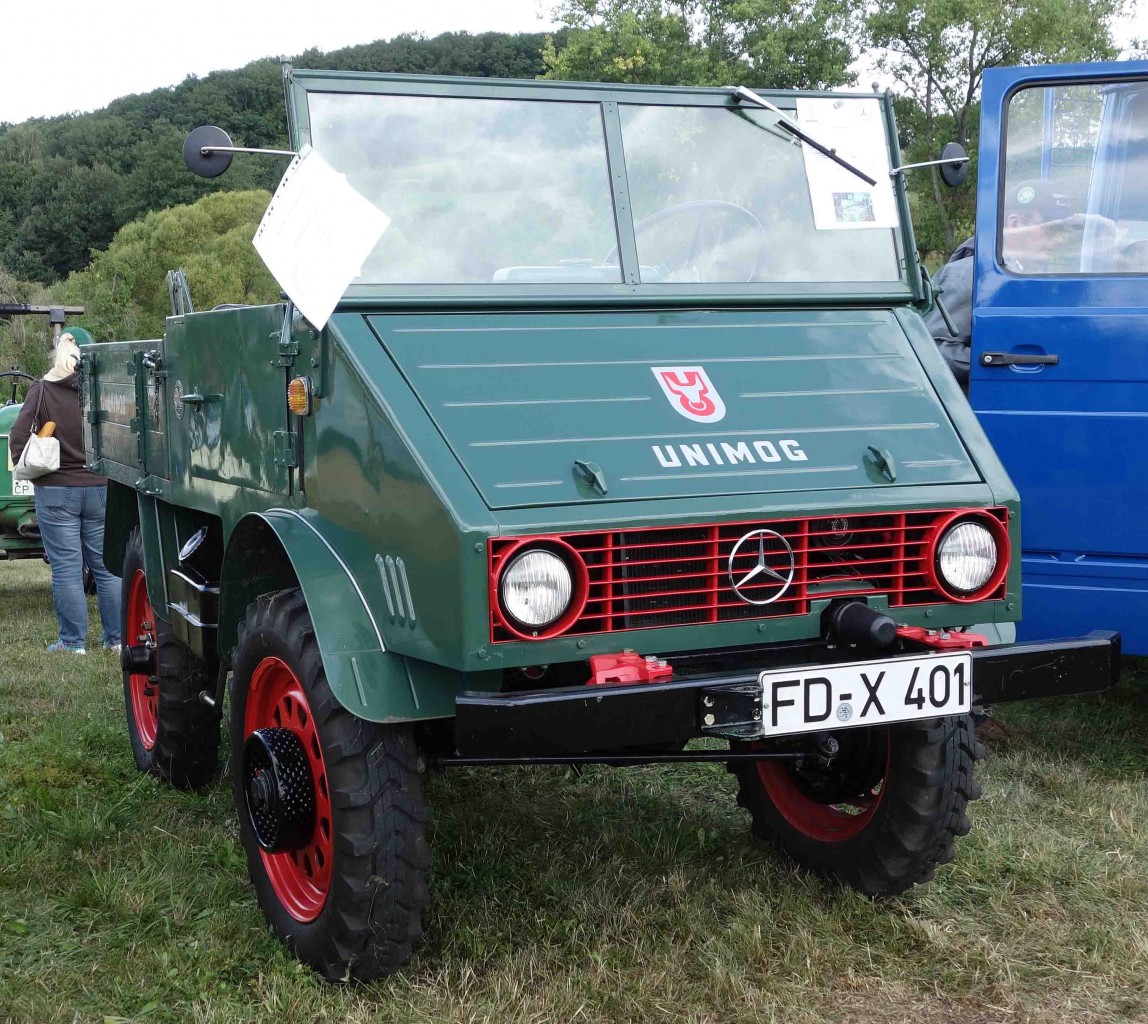 Unimog steht bei der Oldtimerausstellung der Traktorenfreunde Mackenzell im September 2013