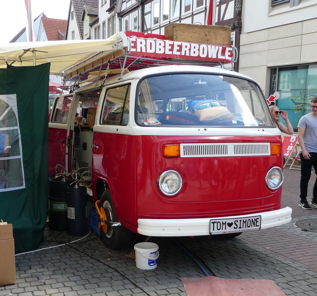 =VW T2 als Erdbeerbowleverkaufstand gesehen im Juni 2019 beim Hessentag in Bad Hersfeld