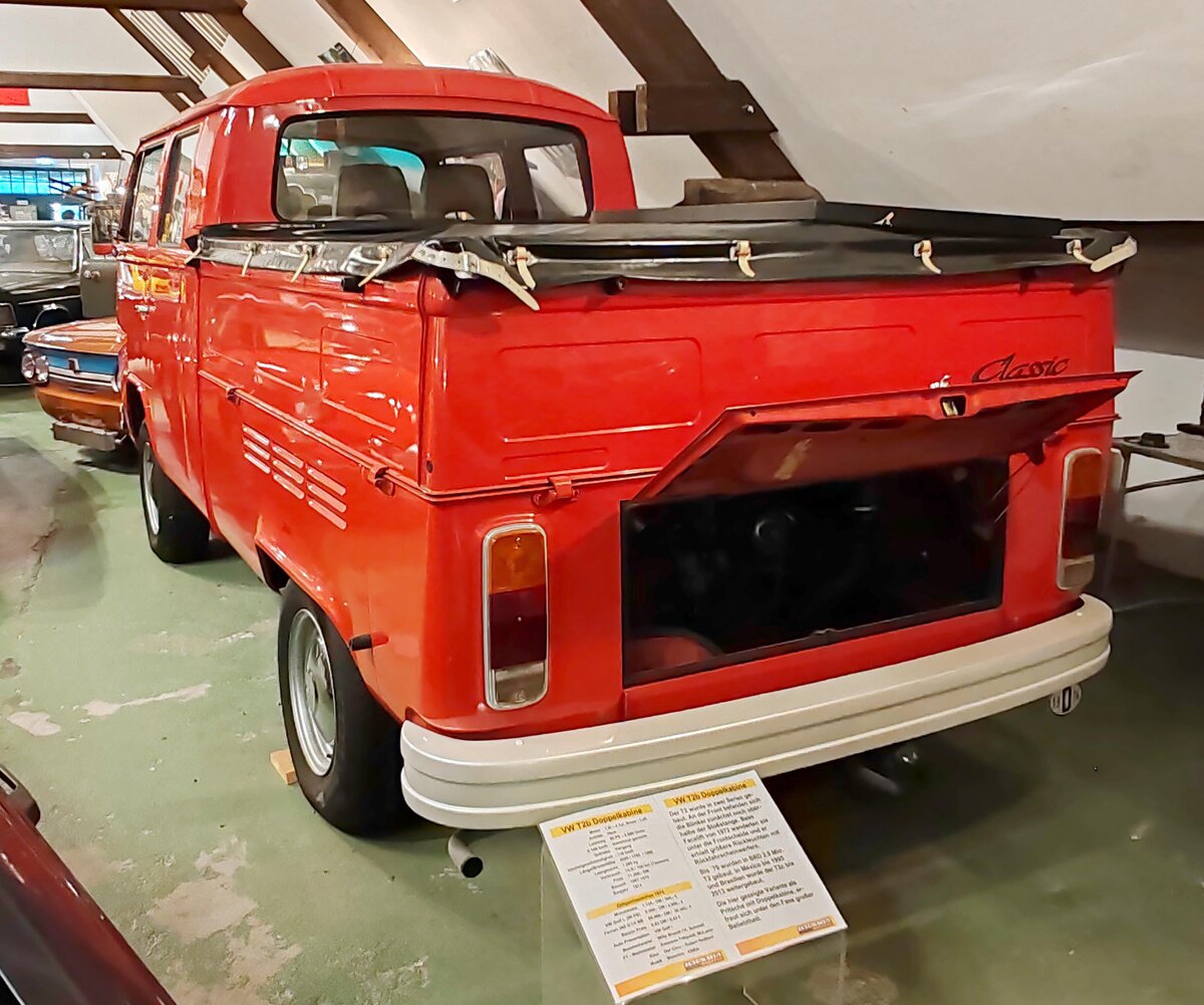 =VW T 2b Doppelkabine, Bj. 1974, 1,6 l, 50 PS, gesehen im Automuseum Wolfegg, Dezember 2023