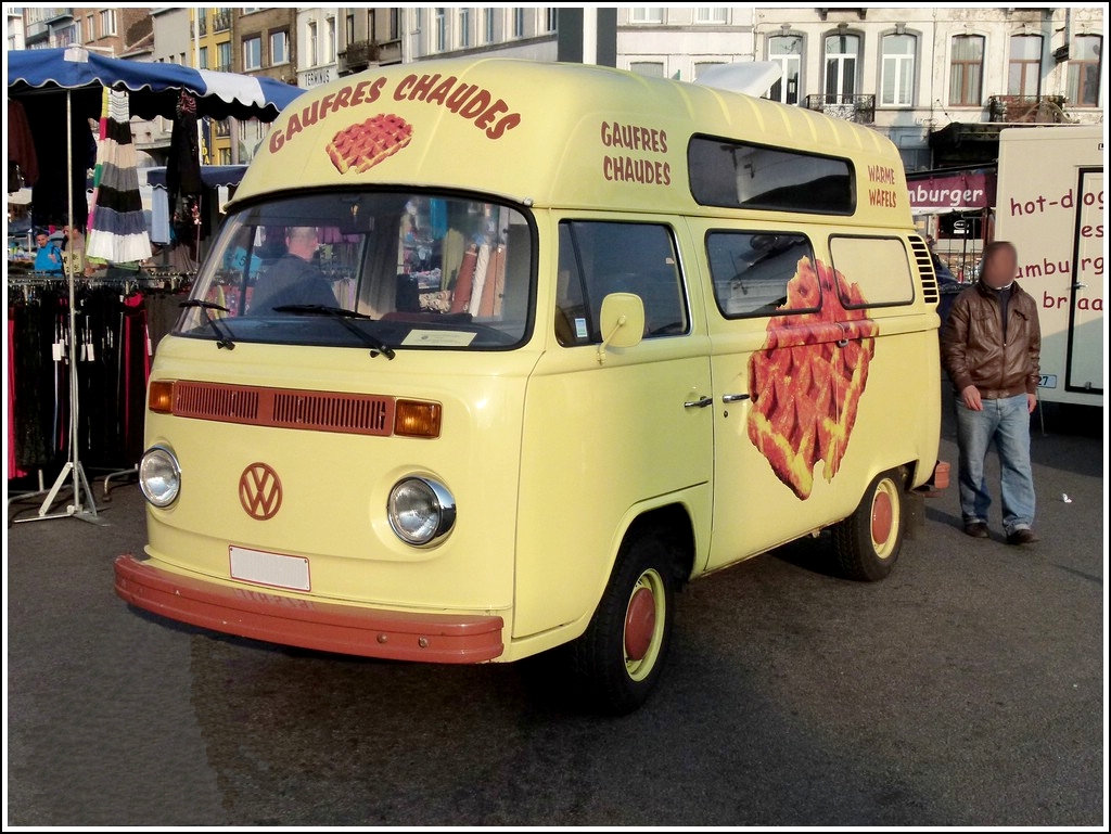 VW T2 als Verkaufstand für Heisse Waffeln auf einem Markt in Brüssel, gesehen am 25.03.2012.