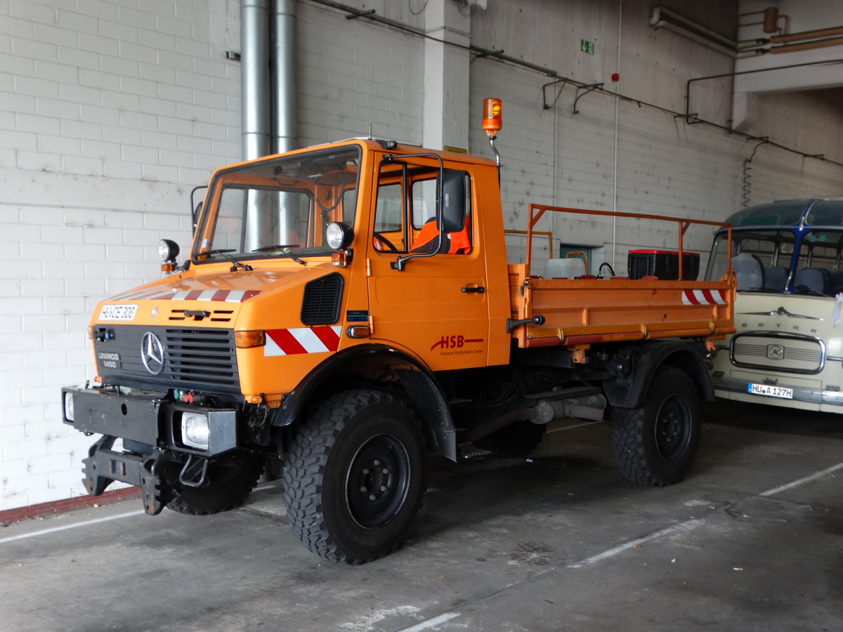Hanauer Straßenbahn Mercedes Benz Unimog U1450 ist der Abschlepp Wagen wenn mal ein Bus liegen bleibt. Das Foto entstand am 09.09.16 im Betriebshof Hanau bei einer Besichtigung