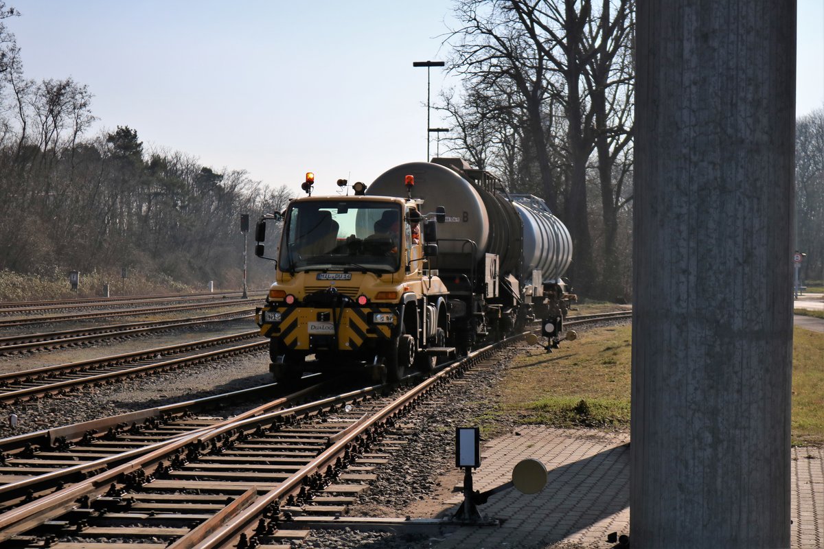 Dualogis Mercedes Benz U400 Zweiwege Unimog beim Rangieren in Obernburg-Elsenfeld am 23.02.18 Das Foto wurde von einen Gehweg aus gemacht