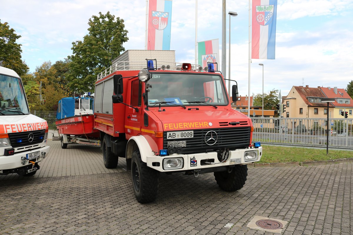 Feuerwehr Aschaffenburg Mercedes Benz Unimog 1300 mit Boot am 29.09.19 beim Tag der offenen Tür