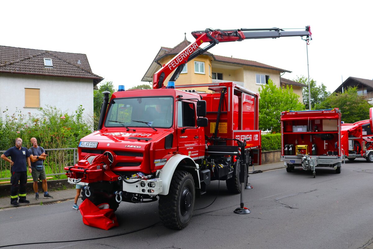 Feuerwehr Bad König (Odenwald) Mercedes Benz Unimog U5023 GW-L Kats mit den einzelnen Modulen am 18.08.24 beim Kreisfeuerwehrtag in Reichelsheim