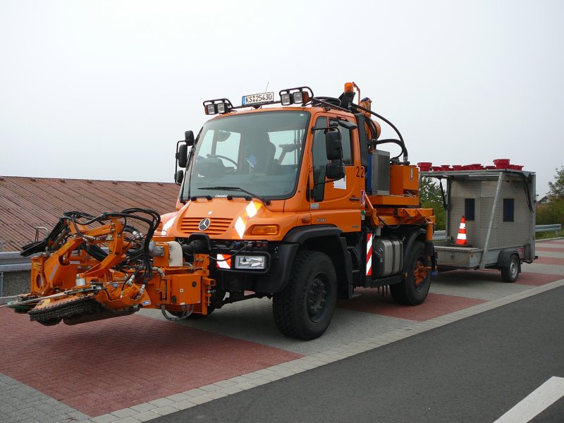 Unimog U 400 der Strassenmeisterei Kirchheim mit Anbaugeräten gesehen am 20.10.2009 im Bereich der Landesgrenze Hessen - Thüringen