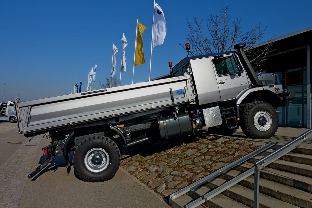 Unimog Zetros, zeigt seine Geländetauglichkeit vor der Messehalle bei der Automobil 2012 in Freiburg, Feb.2012