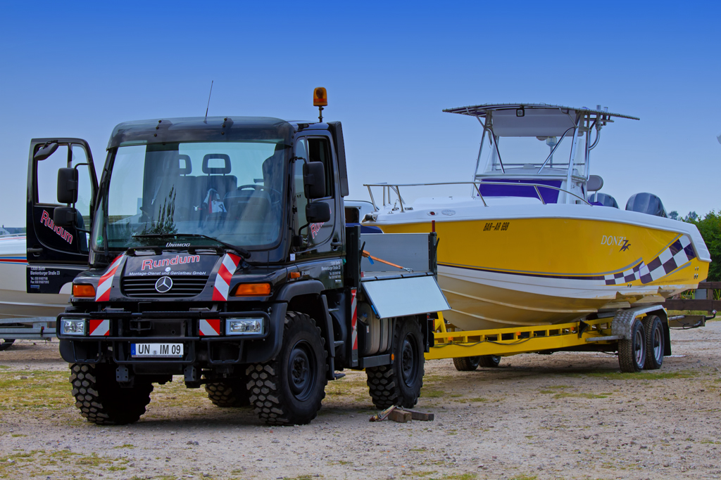 Nach Ende des Ueckermünder Speedbootrennens vom 13.-16. Sep. 2012 wird das "Gespann" für die Rückfahrt vorbereitet.