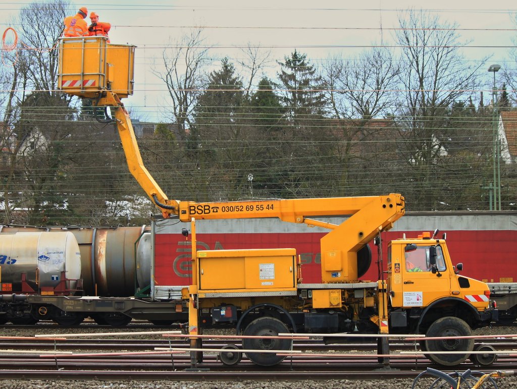 Oberleitungsmontage bei der Bahn mit Hilfe eines Zweiwegeunimog mit Hubbühne der Firma BSB am 17.03.2013 in Aachen West
