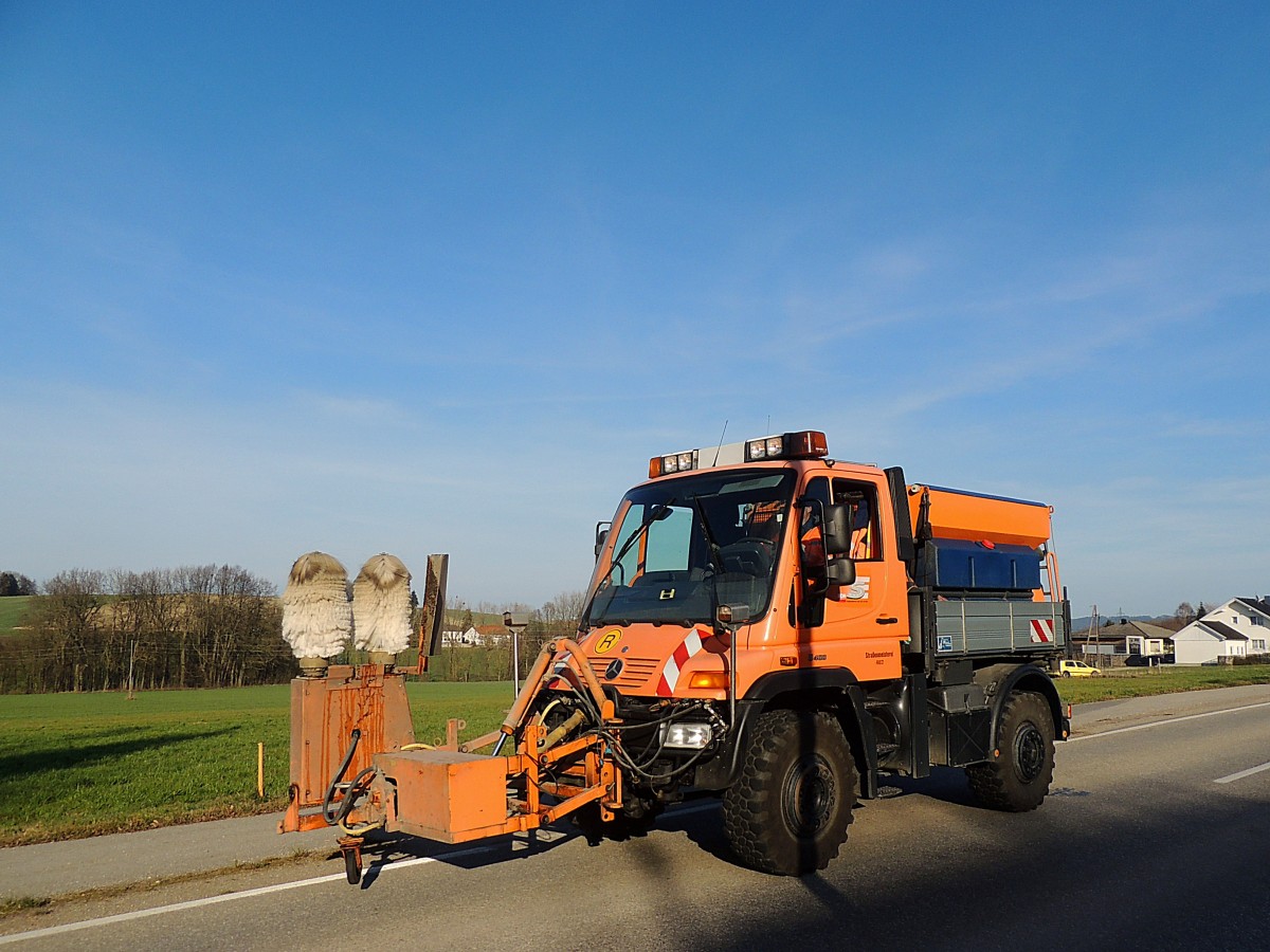 Unimog,U400 der Strassenmeisterei mit Anbau zum Reinigen der Leitpflöcke; 140317