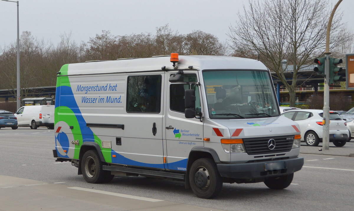 Berliner Wasserbetriebe mit einem MB 816 D Transporter am 03.02.22 Berlin Marzahn.