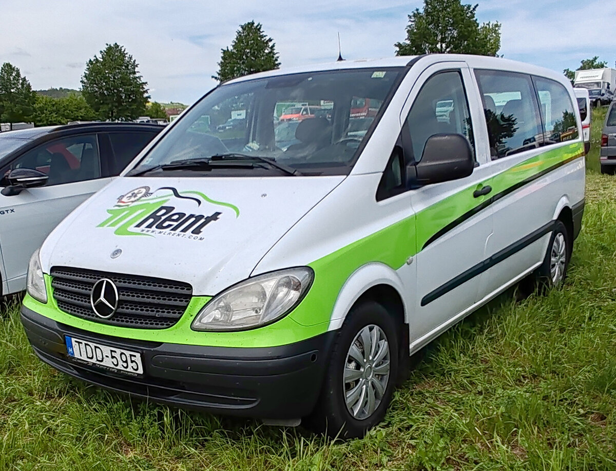 =MB Vito als Mietfahrzeug aus Ungarn, gesehen im Mai 2024 auf dem Besucherparkplatz der RettMobil in Fulda