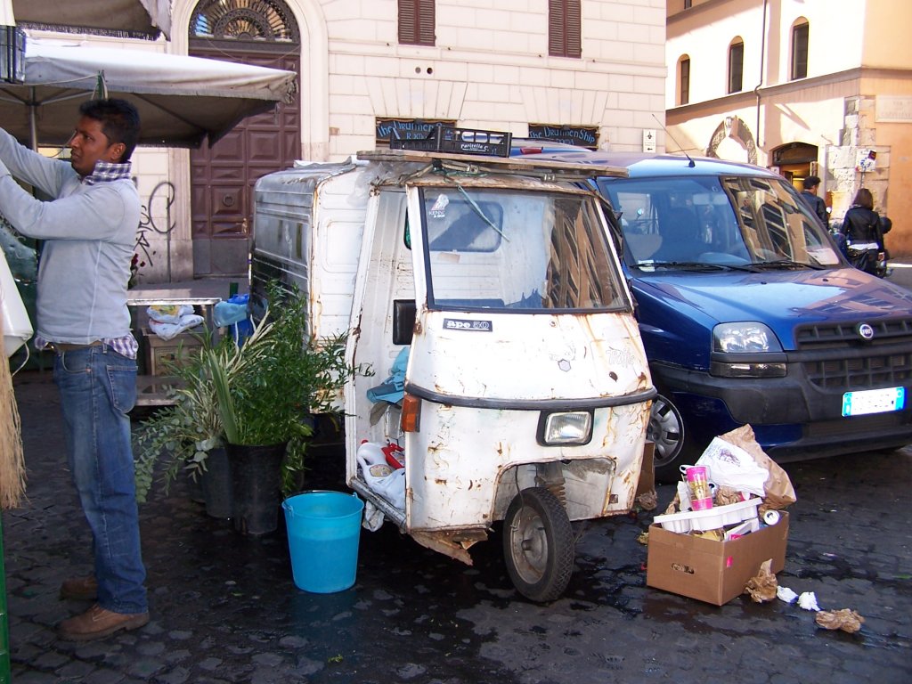 Piaggio Ape gesehen auf einem Wochenmarkt in Rom, Oktober 2010