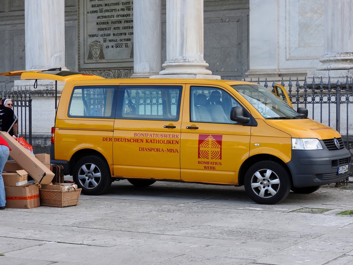 VW-T5 vom Bonifatiuswerk der deutschen Katholiken, hat sich vor bei der Basilika Sankt Paul vor den Mauern in Rom eingefunden; 151023