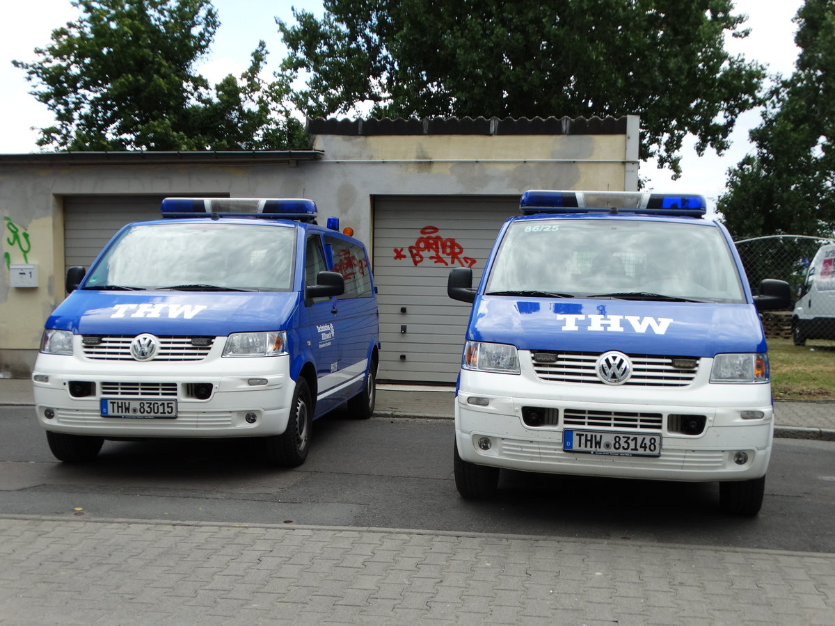 Zwei THW Ortsverband Frankfurt VW Transporter T5 am 17.07.16 beim Osthafen Festival 2016 in Frankfurt