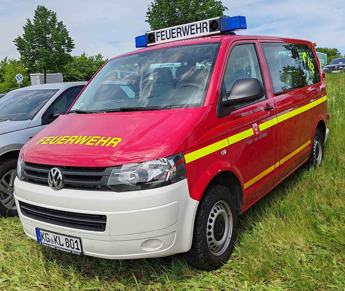 =VW T5 der Feuerwehr BAD KISSINGEN, gesehen im Mai 2024 auf dem Besucherparkplatz der RettMobil