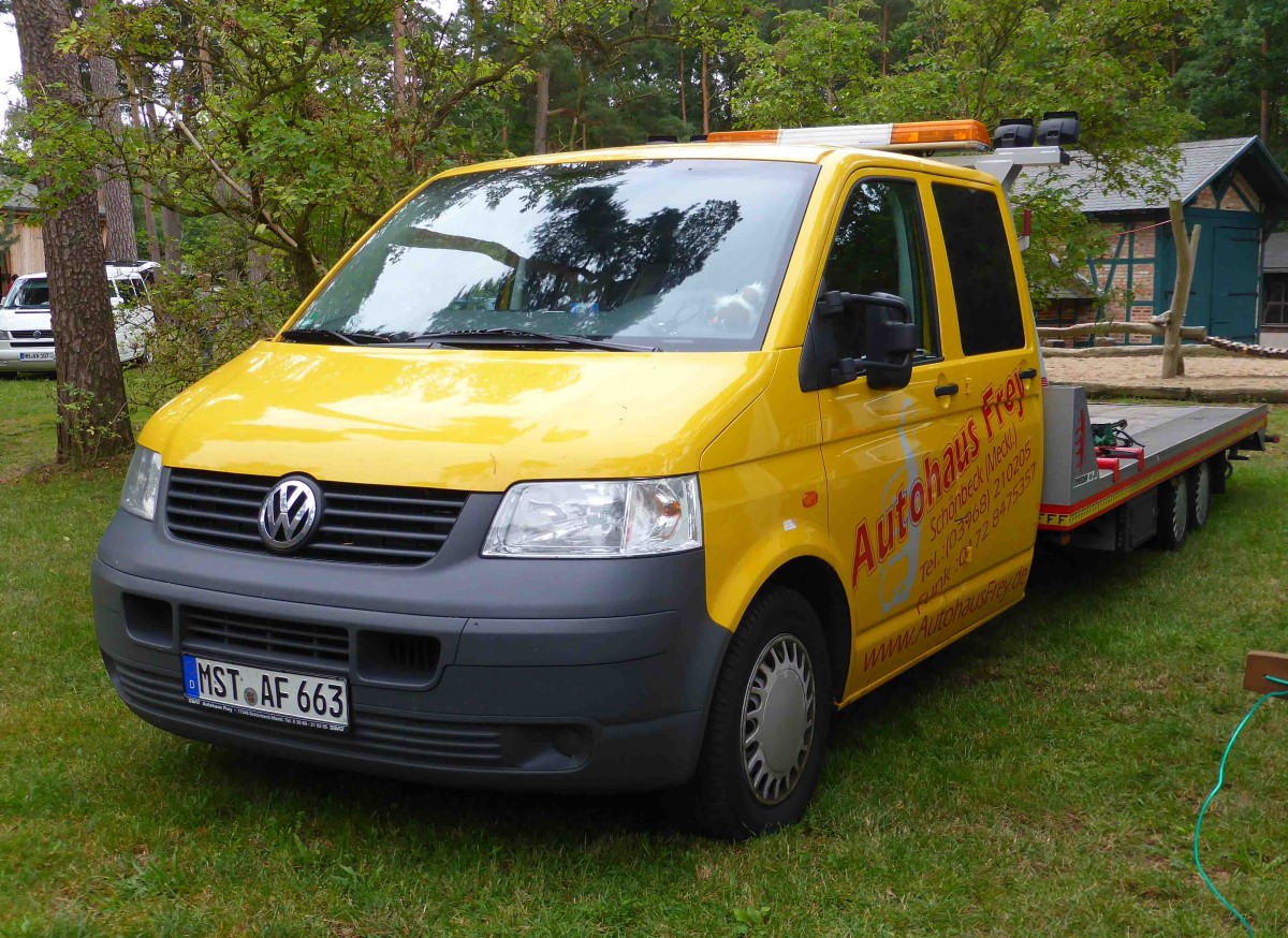 VW T5 als Transportfahrzeug für ein Oldtimerschätzchen, gesehen im Agroneum Alt Schwerin im August 2014