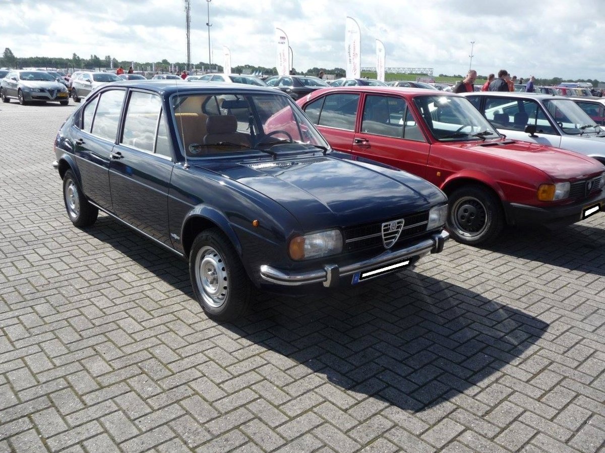 Alfa Romeo Alfasud der ersten Serie, wie er von 1972 bis 1980 produziert wurde. Der Wagen mit Frontantrieb sollte die Alfa Romeo Produktpalette nach unten abrunden. Er wurde im Werk Pomigliano bei Neapel produziert. Dieses Werk wurde für die Produktion des Modells erweitert, um im strukturschwachen Süditalien Arbeitsplätze zu schaffen. Allerdings wurde dieses Werk häufig bestreikt und durch anderweitige Arbeitsniederlegungen "lahm gelegt". Der abgelichtete Alfasud ist im Farbton blu olandese lackiert. Der Vierzylinderboxermotor hat einen Hubraum von 1186 cm³ und leistet 63 PS. Spetacolo Sportivo im August 2018 an der Rennstrecke in Zandvoort/NL.