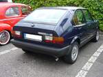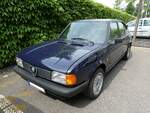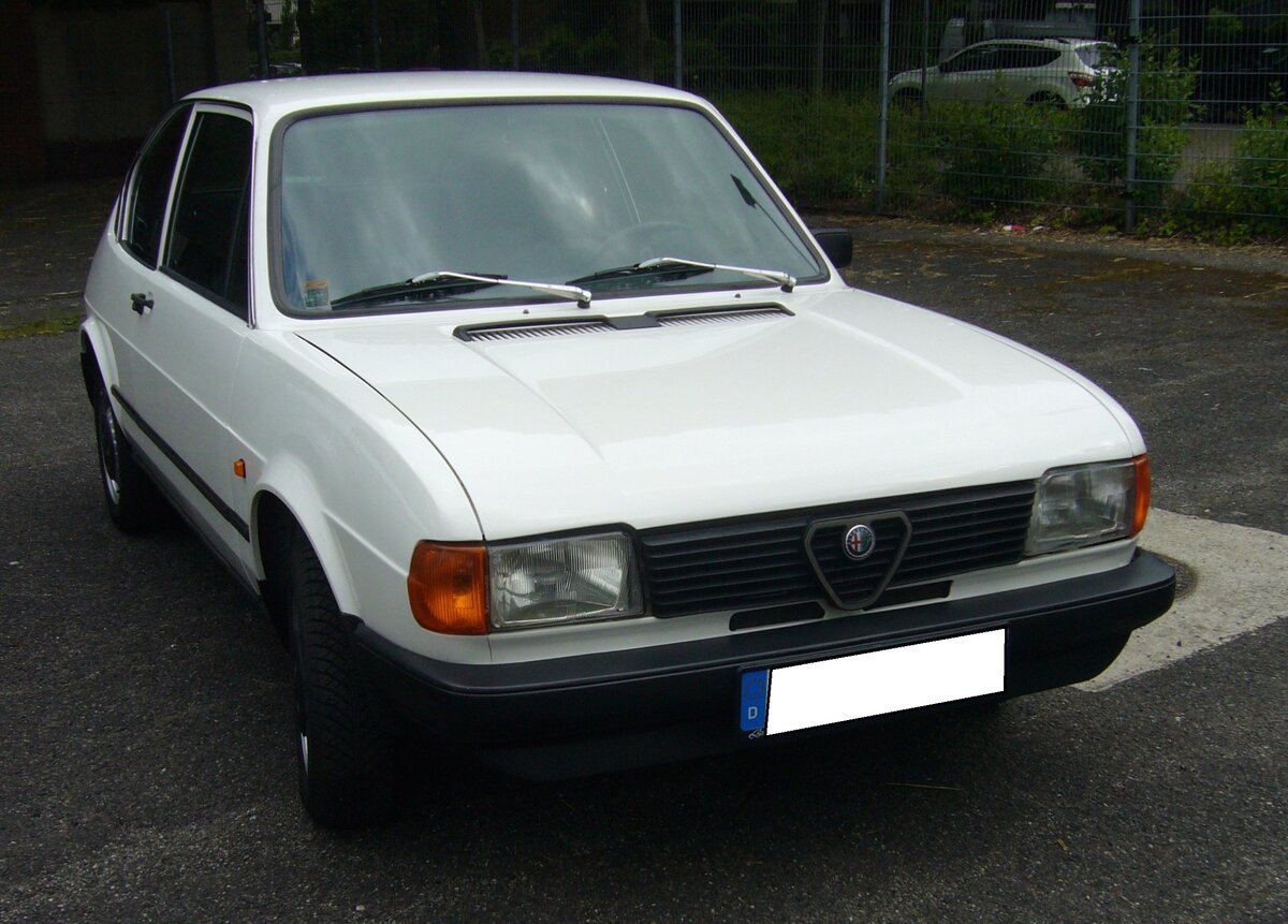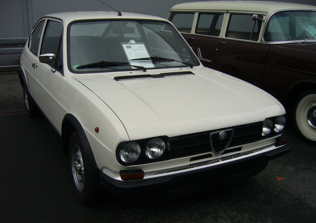 Alfa Romeo Alfasud 1.5ti aus dem Jahr 1979. Alfa Romeo Alfasud 1.5ti der zweiten Serie, wie er von 1978 bis 1980 produziert wurde. Der Wagen mit Frontantrieb sollte die Alfa Romeo Produktpalette nach unten abrunden. Er wurde im Werk Pomigliano bei Neapel produziert. Dieses Werk wurde für die Produktion des Modelles erweitert, um im strukturschwachen Süditalien Arbeitsplätze zu schaffen. Allerdings wurde dieses Werk häufig bestreikt und durch anderweitige Arbeitsniederlegungen "lahm gelegt". Der abgelichtete Alfasud ist im Farbton bianco porcellana lackiert. Der Vierzylinderboxermotor hat im 1.5ti einen Hubraum von 1490 cm³ und leistet 84 PS. Der abgelichtete Alfasud verbrachte fast sein ganzes "Autoleben" im sonnigen Südfrankreich. Außengelände der Techno Classica Essen am 13.04.2023.