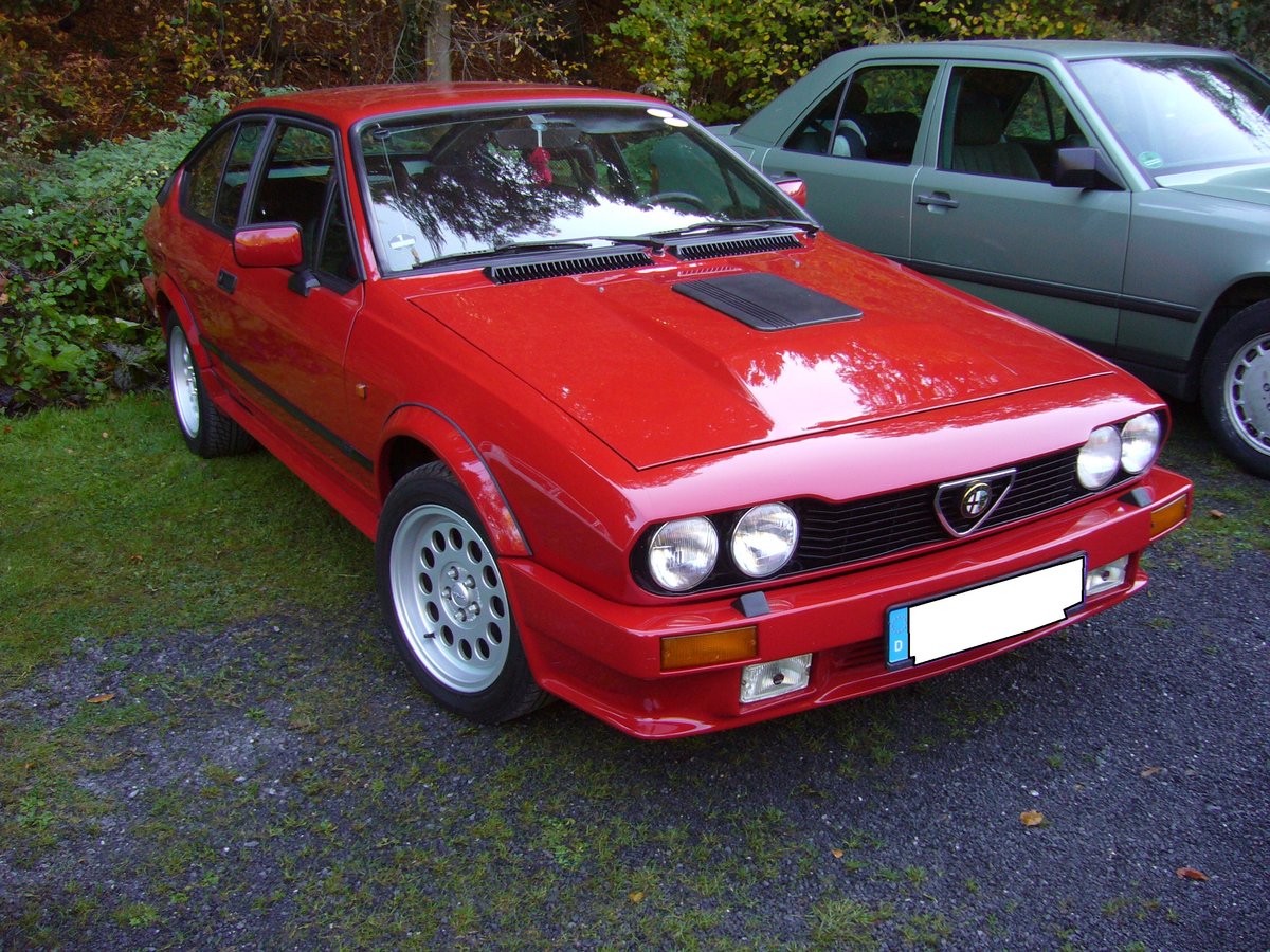 Alfa Romeo Alfetta GTV, gebaut von 1974 bis 1986. Während der dreizehnjährigen Produktionszeit durchlief das Modell etliche optische (Facelifts) und technische Veränderungen. Hier wurde ein Modell der Baujahre 1980 bis 1986 abgelichtet. Aufgrund der Hutze auf der Motorhaube, müsste es sich um eine Alfetta GTV6 handeln. Der V6-motor hat einen Hubraum von 2492 cm³ und leistet 160 PS. Die Höchstgeschwindigkeit wurde damals mit 205 km/h angegeben. Oldtimertreffen "Schwarzwaldhaus" in Mettmann am 21.10.2018.