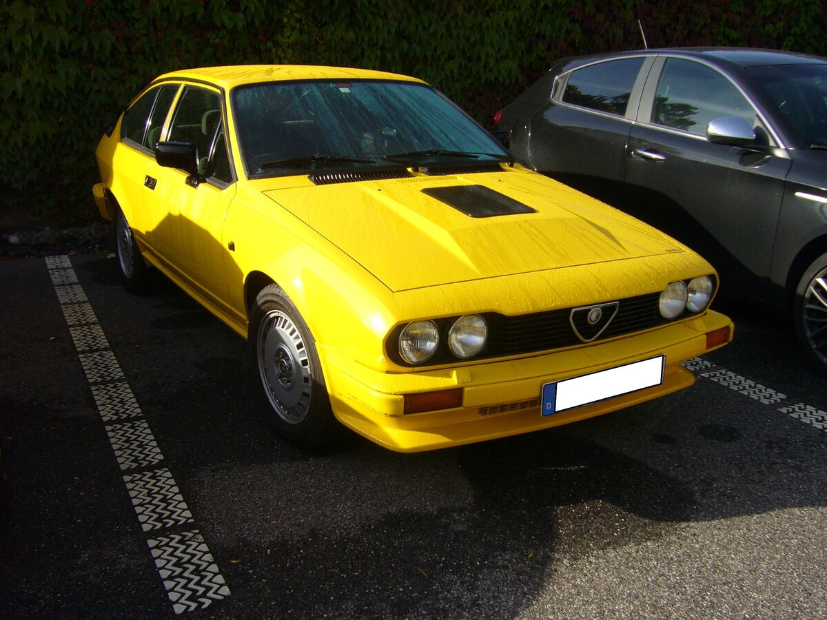 Alfa Romeo Alfetta GTV 6 2.5 Litri. Das Oberklassemodell Alfetta erschien 1972 als viertürige Limousine. Wie bei den "Milanesen" üblich, folgte einige Zeit später, in diesem Fall 1974, eine Coupeversion. Aufgrund seiner Korrosionsanfälligkeit war dem GT bzw. GTV in Deutschland kein besonders großer Verkaufserfolg beschienen. Unter der Motorhaube verrichtet in diesem Modell ein V6-Motor seine Arbeit. Aus einem Hubraum von 2492 cm³ leistet dieser Motor 160 PS. Die Höchstgeschwindigkeit wurde damals von Alfa Romeo mit 205 km/h angegeben. Besucherparkplatz der Düsseldorfer Classic Remise am 28.09.2021.