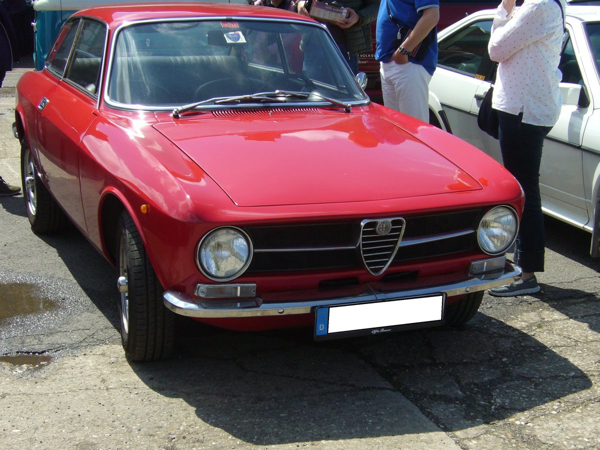 Alfa Romeo GT 1300 Junior. 1966 - 1970. Die GT oder auch Sprint genannten Modelle waren die zweitürige Coupeversion der bereits 1962 vorgestellten Giulia. Der 4-Zylinderreihenmotor mit 1.290 cm³ Hubraum leistet 89 PS. Im Jahr 1970 erfuhr das Coupe ein Facelift. Die Modelle vor diesem Facelift werden aufgrund der etwas abgesetzten Motorhaube auch "Kantenhauber" genannt. Oldtimertreffen an der "Alten Dreherei" in Mülheim an der Ruhr am 15.06.2019.