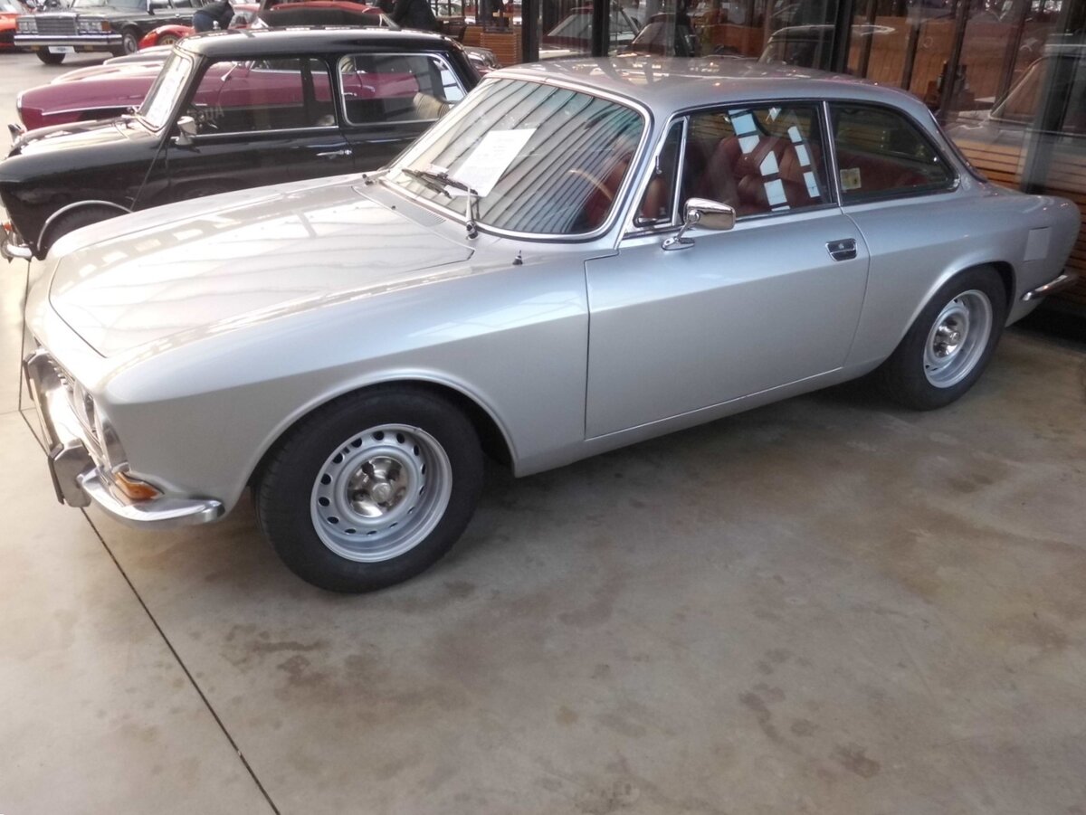 Alfa Romeo 2000 GT Veloce (kurz GTV), produziert in den Jahren von 1971 bis 1976. Der in 44.301 Einheiten produzierte 2000 GTV war das Spitzenmodell der bereits seit 1963 gebauten "Junior" Modell-Reihe. Motorisiert mit einem Vierzylinderreihenmotor mit einem Hubraum von 1.962 cm³ und einer Leistung von 131 PS machten diesen, damals noch erschwinglichen Sportwagen, 200 km/h schnell. Der gezeigte Wagen aus dem vorletzten Modelljahr 1975 dürfte im Farbton argento lackiert sein. Classic Remise Düsseldorf am 15.01.2026.