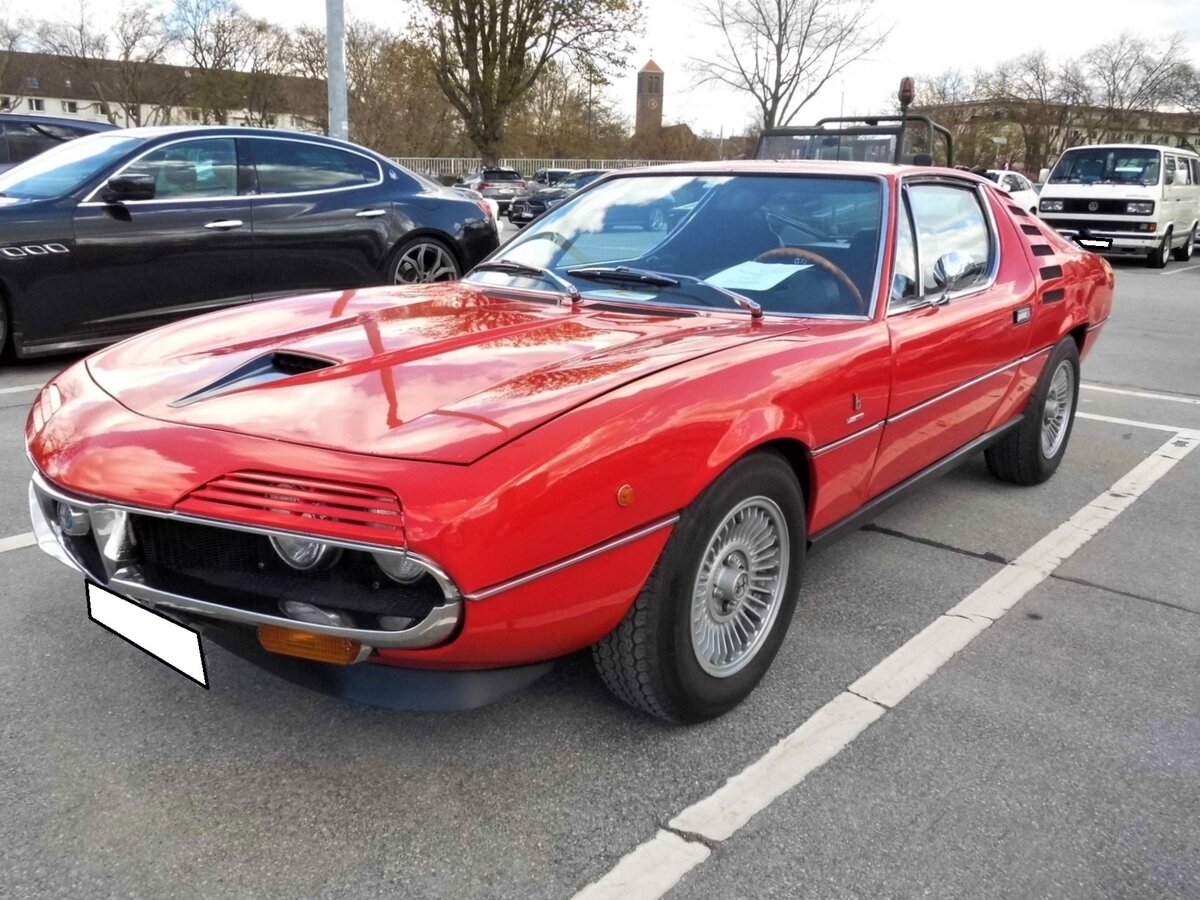 Alfa Romeo Montreal. Dieser Montreal ist im Farbton rosso 501 lackiert. Produziert wurden in den Jahren von 1970 bis 1977 insgesamt 3.917 Autos dieses Typs. Der Wagen wurde als Designstudie auf der Weltausstellung (Expo) 1967 im kanadischen Montreal vorgestellt. Da dieser hübsche Sportwagen großen Anklang fand, ging er ab 1970 in Serie. Den Namen seines Vorstellungsortes behielt er bei. Der V8-Motor hat einen Hubraum von 2.593 cm³ und leistet 200 PS. Das Fahrwerk wurde vom Typ 105 (Giulia) übernommen. Besucherparkplatz der Techno Classica in Essen am 13.04.2023.