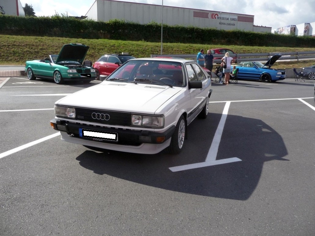 Audi Coupe der zweiten Serie, wie es von 1984 bis 1987 produziert wurde. Im März 1980 wurde die "Fahrmaschine" Audi Quattro vorgestellt. Im September 1980 folgte das ähnlich aussehende Coupe, ohne jedoch auf Allradtechnik zurück greifen zu können. Im September 1984 erfolgte ein "Facelift", äußerlich erkennbar am leicht schräg gestellten Kühlergrill und den rechteckigen Frontscheinwerfern. Ein solches Coupe war 1984 ab DM 24.340,00 zu haben. Der Kunde konnte zwischen einem Vierzylinderreihenmotor mit einem Hubraum von 1781 cm³ und Leistungen von 75 PS oder 90 PS, oder einem Fünfzylinderreihenmotor mit einem Hubraum von 1921 cm³ und einer Leistung von 115 PS wählen. Audi und NSU Treffen im Sommer 2018 in Köln.