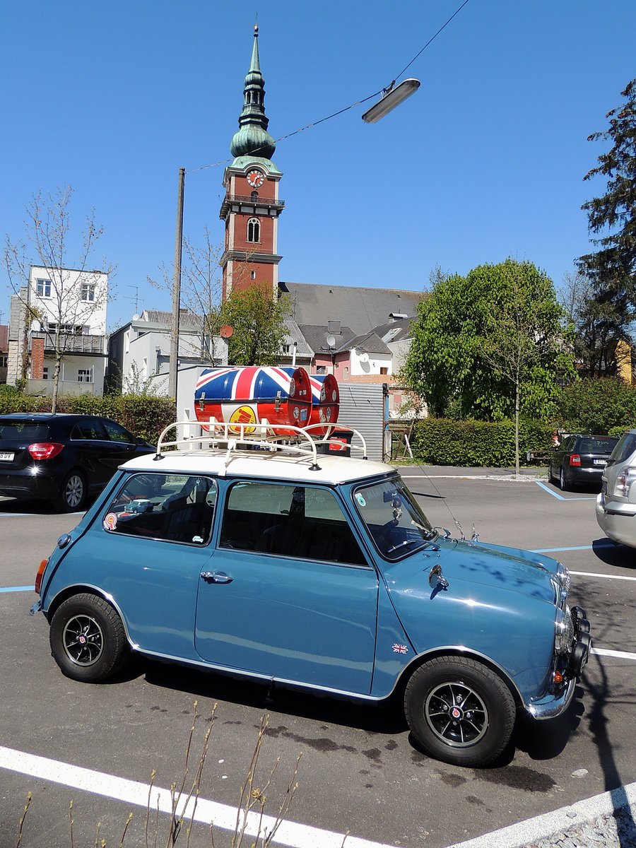 Austin Mini aus dem Jahr 1963 im Farbton powder blue. Bekanntlich wurde der Mini 1959 vorgestellt. Der Kleinwagen wurde im Rahmen des britischen badge engineering auch von anderen britischen Marken hergestellt. Die frühen Mini´s erkennt man an den seitlichen Schiebefenstern und den außenliegenden Türscharnieren. Der quer eingebaute Vierzylinderreihenmotor dieses Kleinwagens hat einen Hubraum von 848 cm³ und leistet 34 PS. Da das  Wägelchen  nur 620 Kilogramm wiegt, erreicht er mit dieser Motorleistung trotzdem eine Höchstgeschwindigkeit von rund 120 km/h. In Deutschland war ein solches Modell im Jahr 1965 ab DM 4670,00 zu bekommen. Classic car meeting in Brynmawr/South Wales am 27.07.2025.