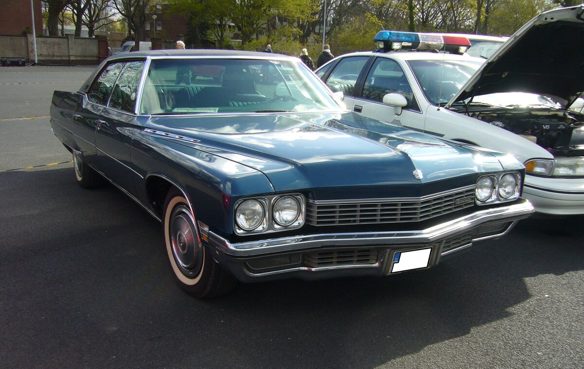 Buick LeSabre fourdoor Sedan aus dem Modelljahr 1972 im Farbton royal blue. Im Modelljahr 1972 war die Modellreihe LeSabre die mittlere Ausstattungsvariante im Programm der GM-Division Buick. Darunter rangierte die Modellreihe Skylark und darüber der Centurion. Als besonders exclusives Modell gab es dann auch noch den Electra 225. Von diesem, viertürigen Modell verkaufte Buick 1972 genau 35295 Fahrzeuge zu einem Preis ab US$ 4041,00. Basismotorisierung war ein V8-Motor mit einem Hubraum von 5824 cm³ und einer Leistung von 183 PS. Gegen aufpreis konnte auch ein V8-Motor mit einem Hubraum von 455 cui (7456 cm³) und einer Leistung von 225 PS bestellt werden. Oldtimertreffen an Mo´s Bikertreff in Krefeld am 10.04.2022.