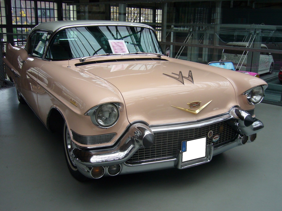 Cadillac Series 62 Coupe de Ville von 1957. Von dieser Karosserievariante verkaufte die Cadillacdivision im Modelljahr 1957 23813 Einheiten. Der Einstiegspreis lag bei US$ 5048,00. Der V8-motor mit 5979 cm³ Hubraum leistet 285 PS. Classic Remise Düsseldorf am 02.11.2014.