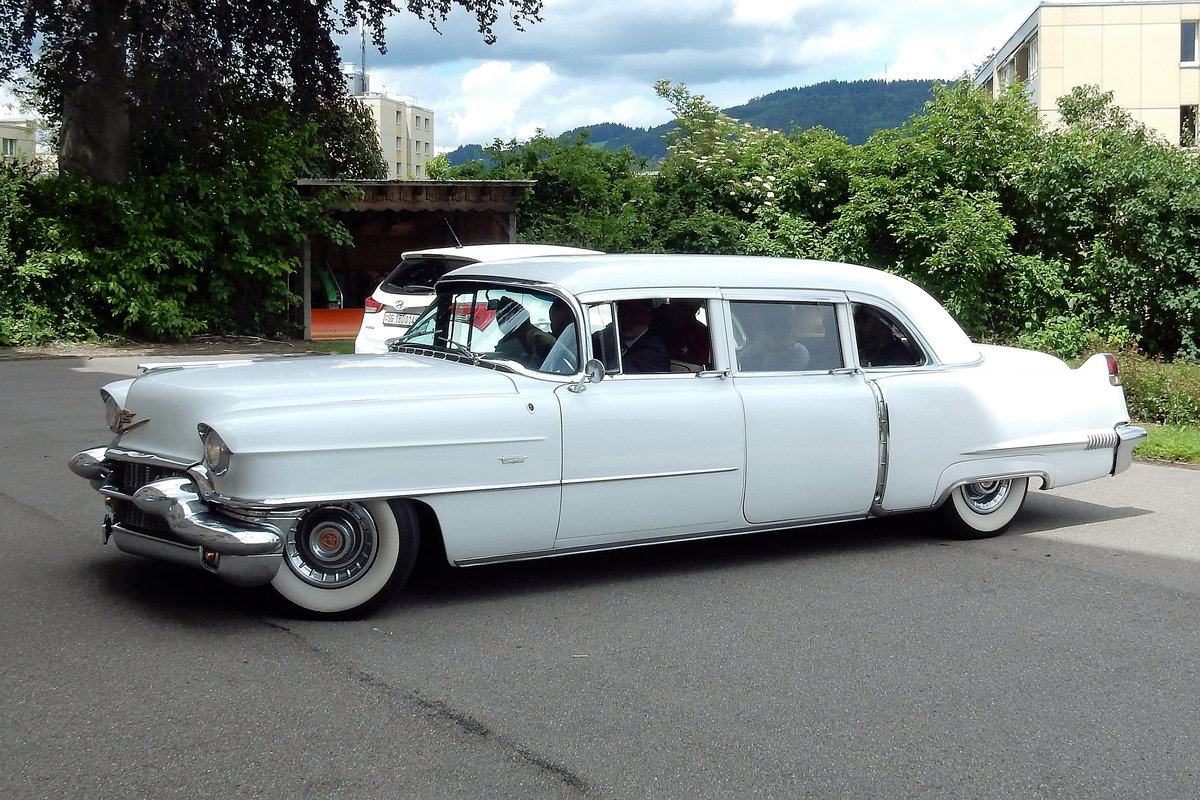 Cadillac Fleetwood Series 75 Limousine, Baujahr 1956. V8, 6 Liter, 285 PS. 8 Sitzplätze, elektrische Sitzverstellung, 4 elektrische Fensterheber. Verbundglas ausser Deck. Leergewicht 2500 kg. Aufgenommen am 18. Juni 2016 in St. Gallen, Schweiz