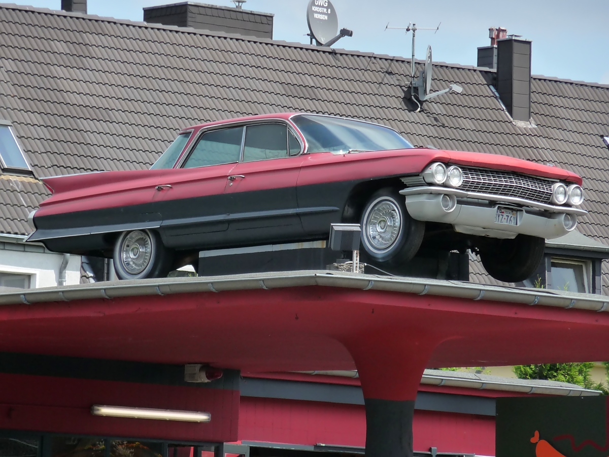 Cadillac Sedan de Ville auf dem Dach eines Currywurst-Restaurants in Viersen, 2.6.2012