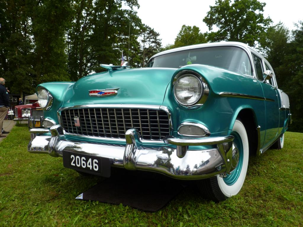 das ist in jedem Fall ein Chevrolet des Modelljahres 1955 in der Karosserievariante 4-door Sedan. Den Radkappen und den seitlichen Zierleisten nach zu erteilen, ist es aber kein Series 2400C Bel Air sondern das darunter angesiedelte "mittlere" Modell Series 2100B.
