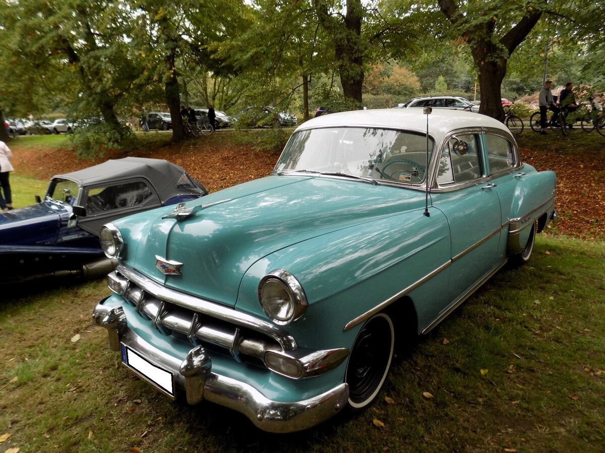 Chevrolet Series 2400 C Bel Air Fourdorr Sedan des Modelljahres 1954. Der Einstandspreis lag bei US$ 2185,00. Der Sechszylinderreihenmotor leistet 115 PS aus einem Hubraum von 3850 cm³. Oldtimertreffen Schloss Lauersfort am 01.10.2019.