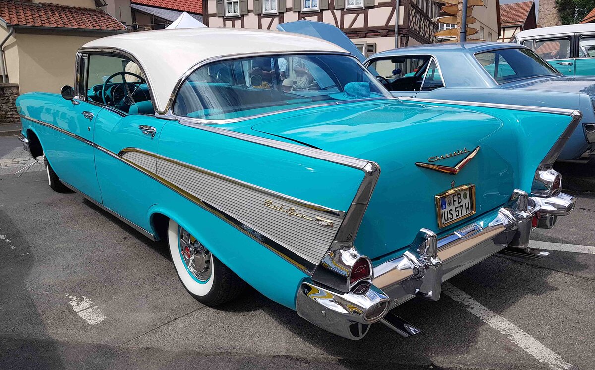 =Chevrolet Series 2400C, 1957er Modell, Karosserieversion Bel Air four door glänzt bei den Fladungen Classics 2023 im Juli 23